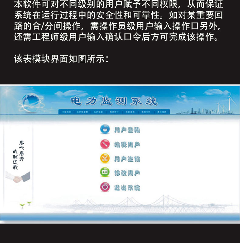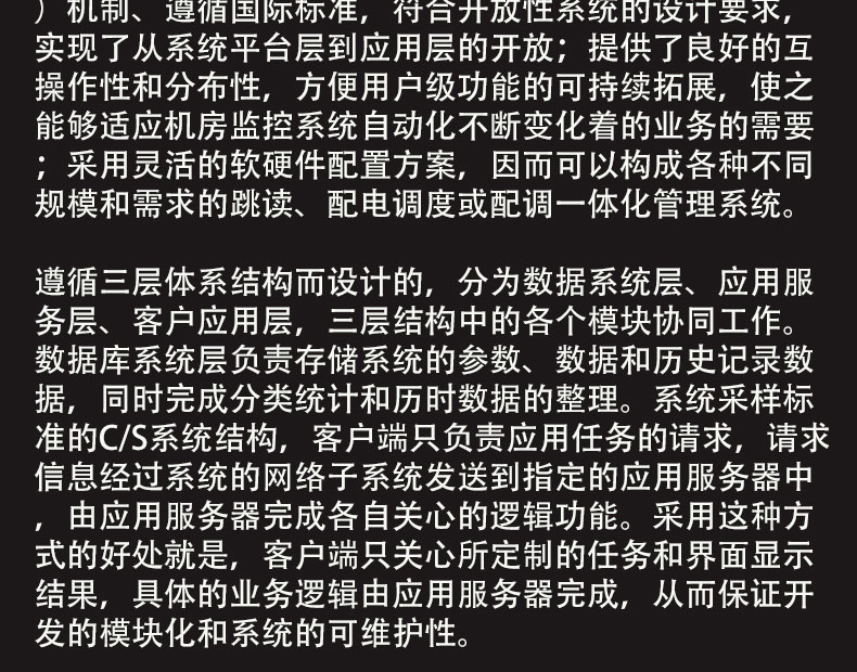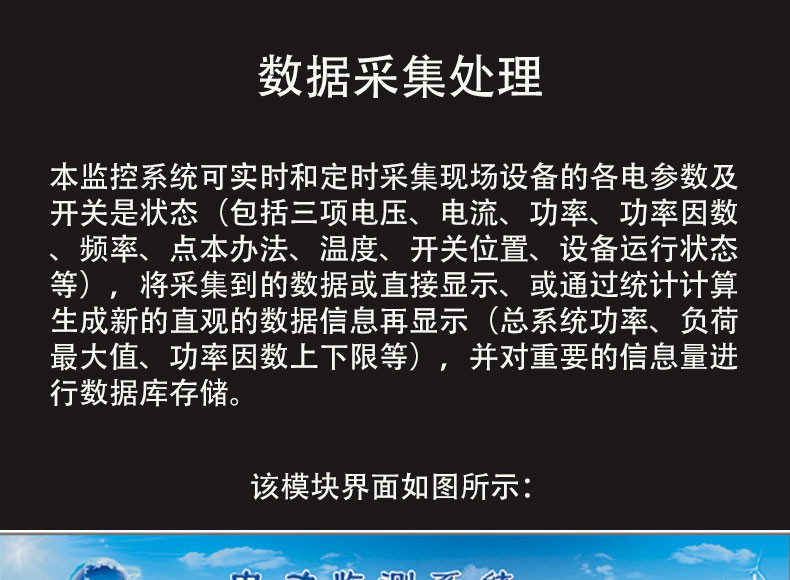本系统主要适用于变电站(所)内部以及与电网相关的电气设备运行状态和环境参数的监控。通过系统将对变电站(所)及其重要设备运行状态和环境参数进行实时监测,对实时数据进行分析,实现对电力系统运行状态进行智能诊断;通过系统可以实现对设备故障预警功能,以及远程巡视功能;通过系统可以实现对变电运行人员进行培训和考核,并可对变电人员的工作绩效进行考核。
