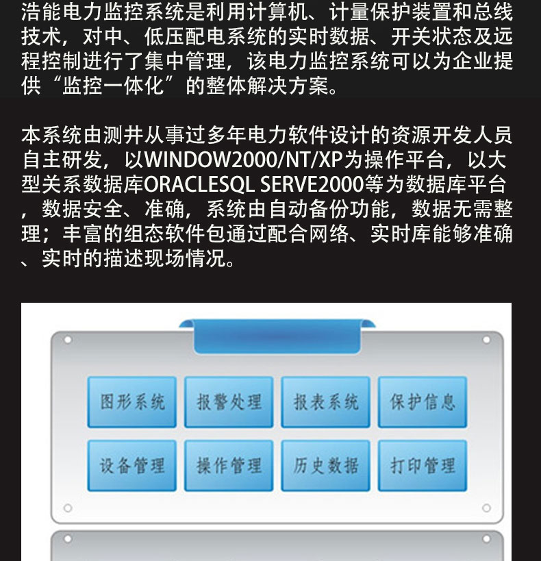 电力监控系统对变电站(所)及其重要设备(如断路器、隔离开关、变压器等)的运行参数进行实时监测,并根据实际需要将相关数据以多种形式显示出来。本系统可应用于变电站(所)的管理与运行工作中,以提高变电站(所)管理与运行的工作效率。