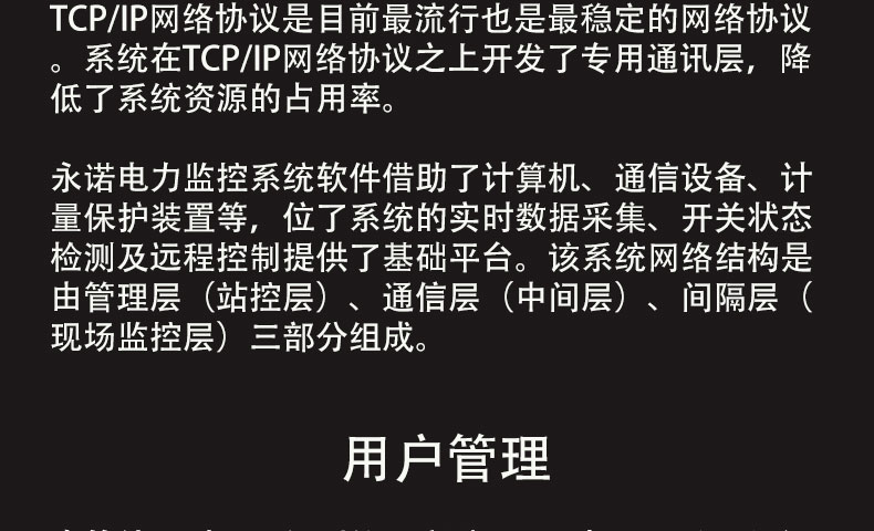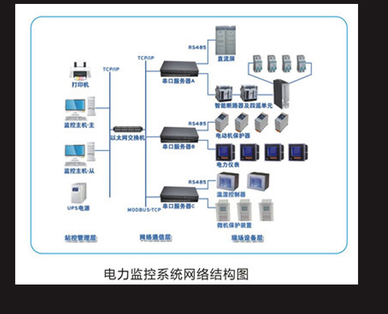 1、远程监控终端:主要完成对变电站(所)及其重要设备的实时状态和运行参数的采集,并将数据上传至监控中心,同时可通过 Modbus TCP/IP通讯协议与监控中心进行实时通讯,实现远程实时监控。